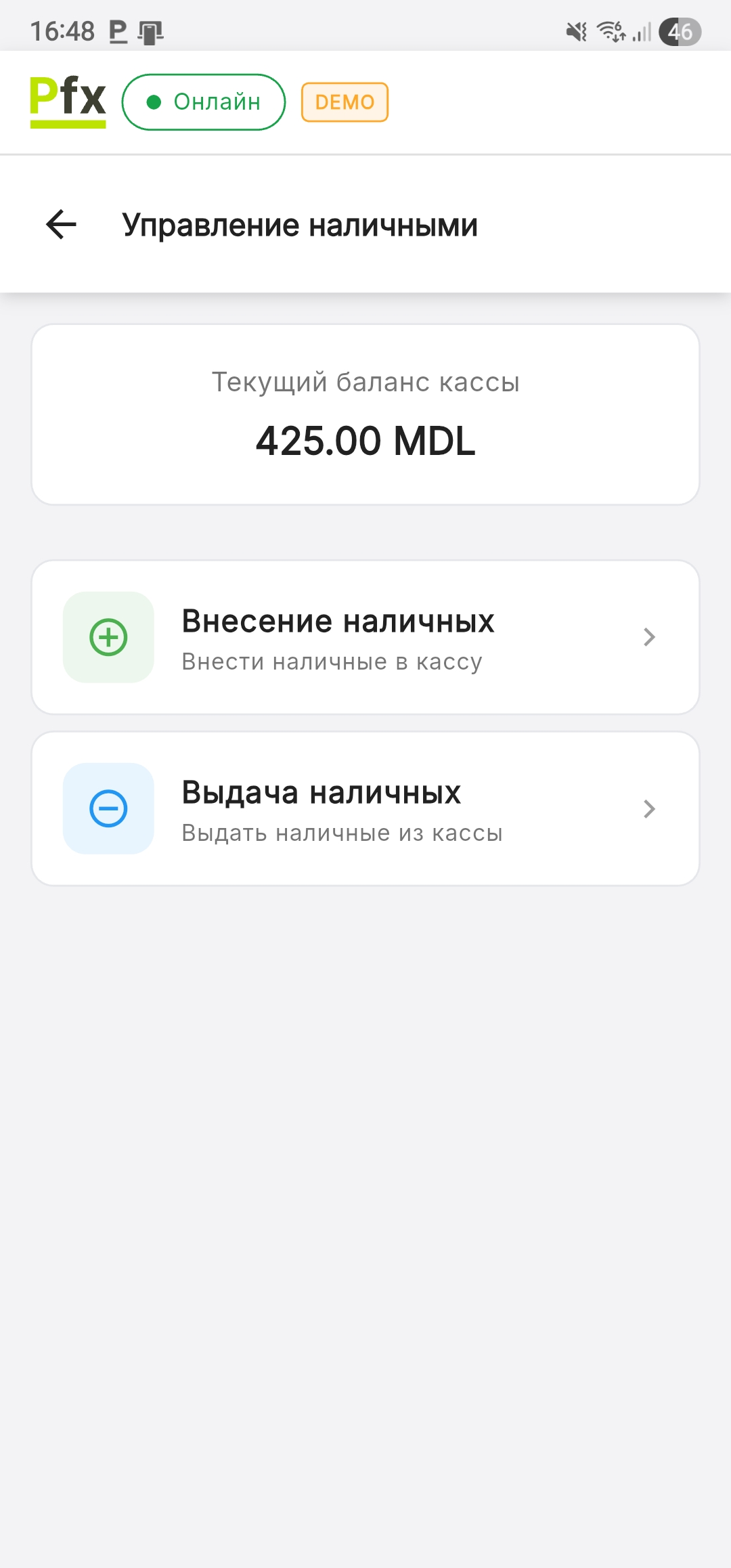 При входе в раздел Управление наличными система отображает сводную финансовую информацию и кнопки действий для операций с денежными средствами: