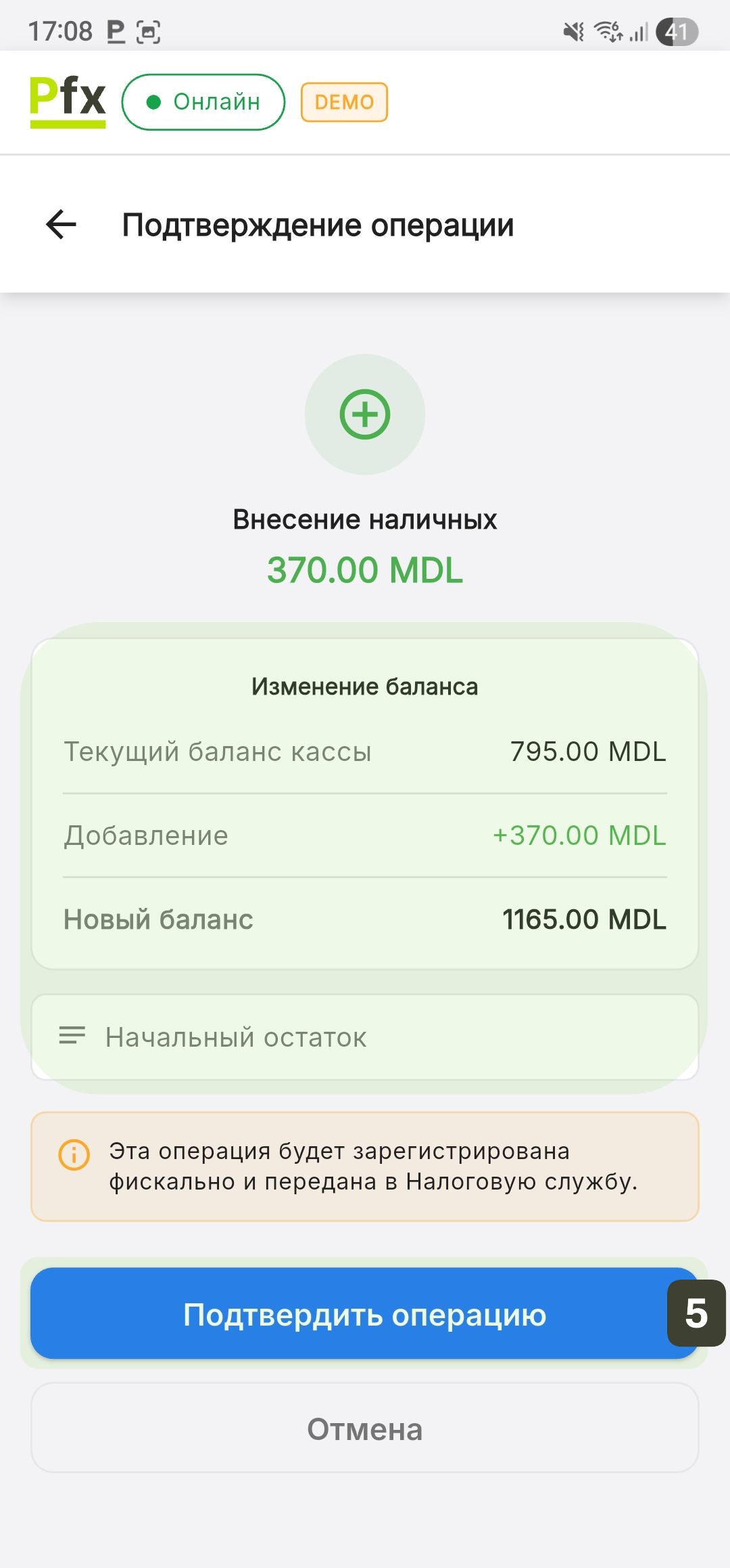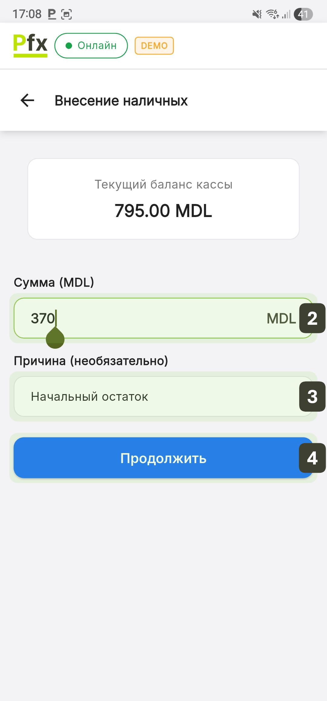 Обеспечьте наличие начального остатка при открытии дня. Используйте функцию Внесение наличных, чтобы зарегистрировать деньги, подготовленные для сдачи, до начала продаж.