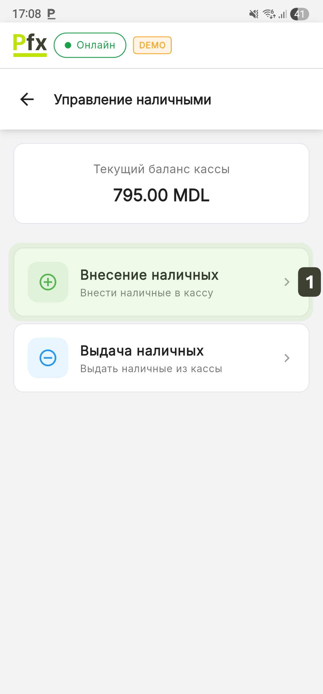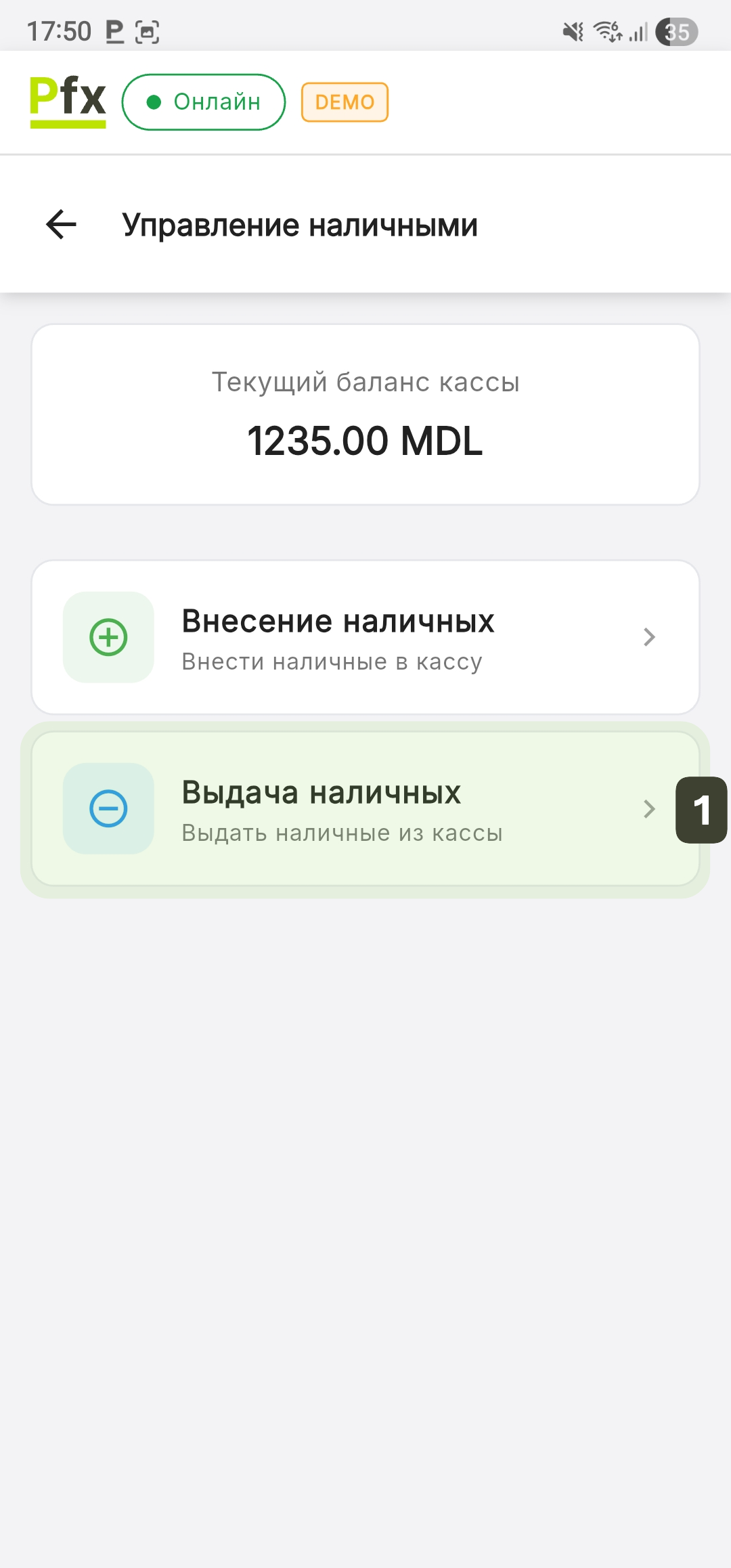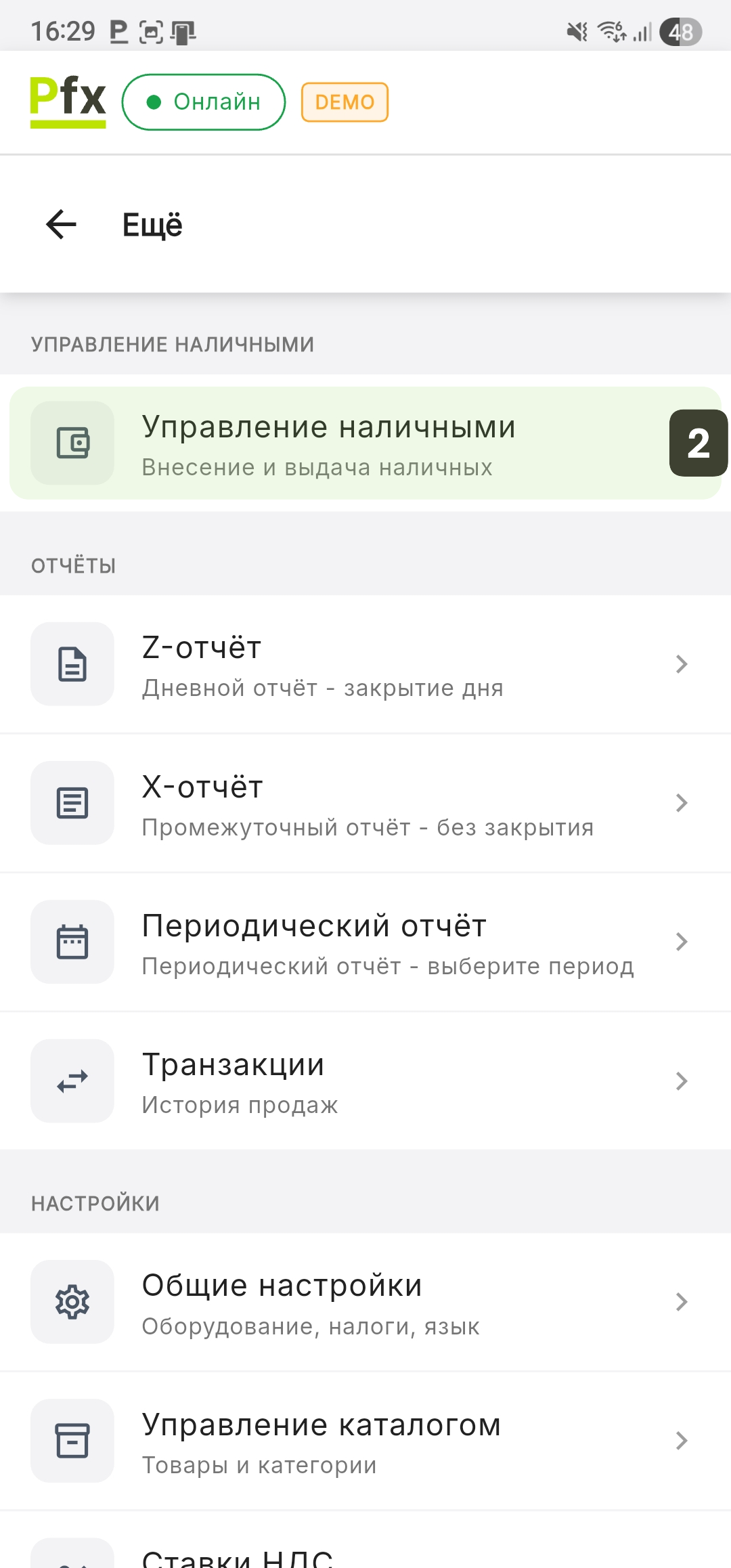- Завершение смены — изъятие наличных в конце рабочего дня для сдачи смены