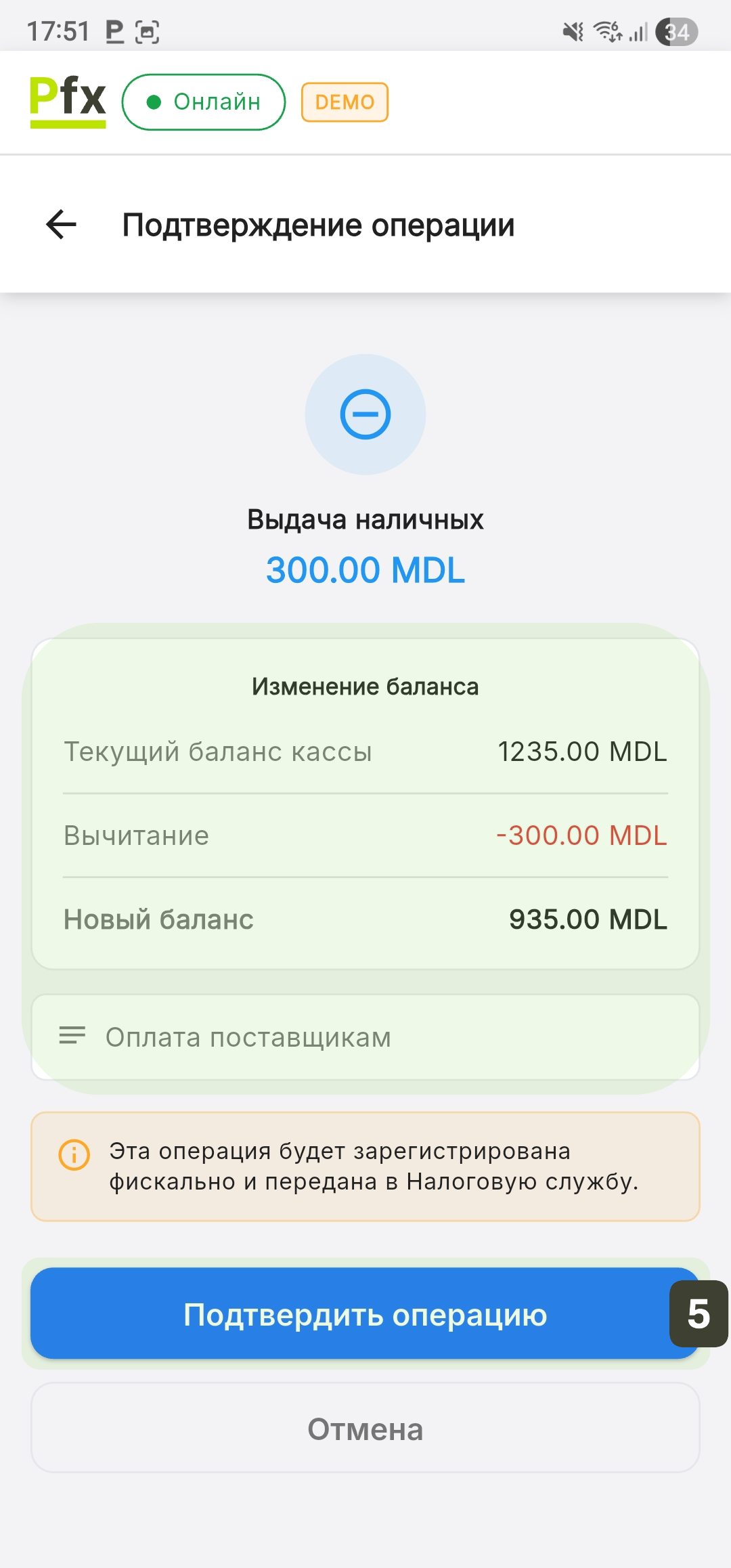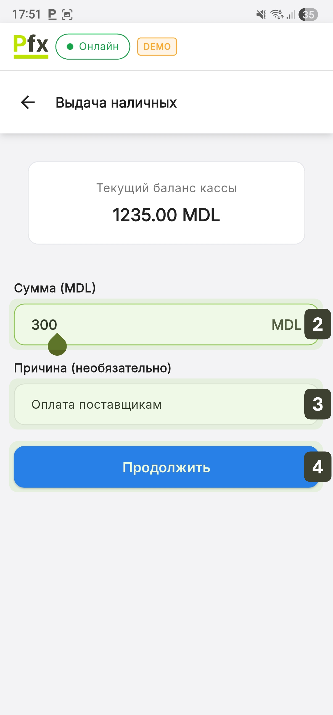 | Выдача наличных | Операция изъятия наличных из кассы |