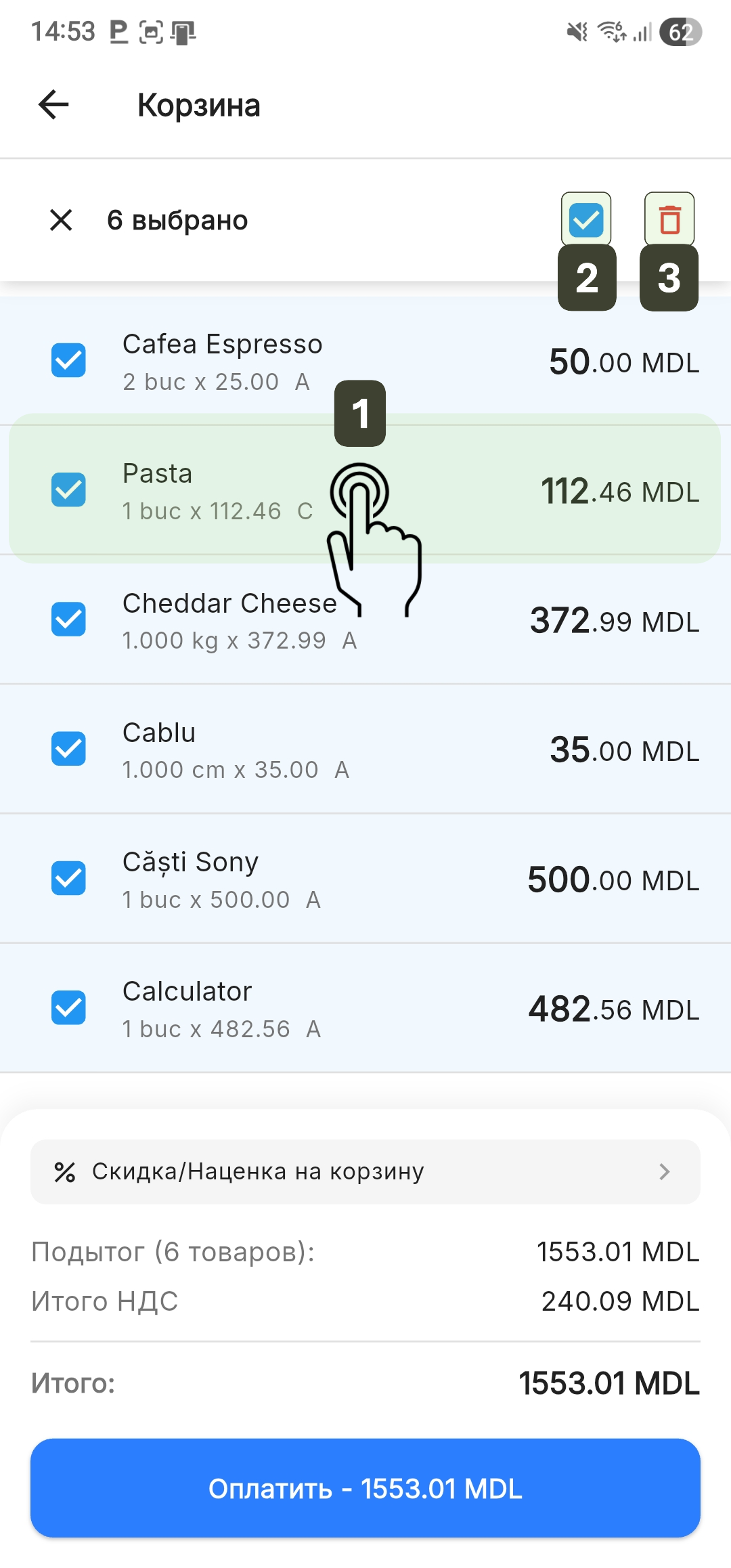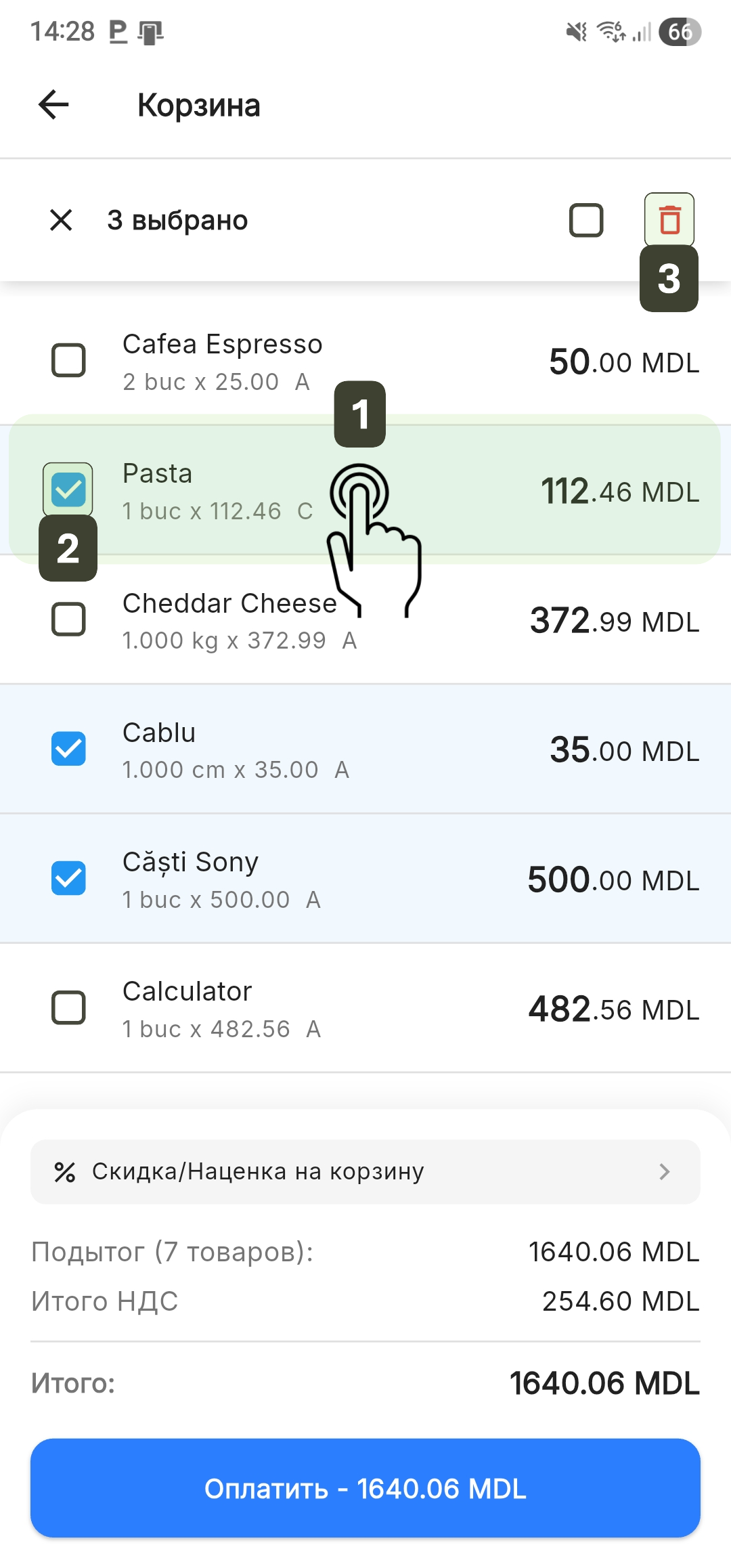 - Для удаления: Активируйте режим выбора долгим нажатием Long Press на товар, отметьте позиции и нажмите красный значок Корзина для мусора