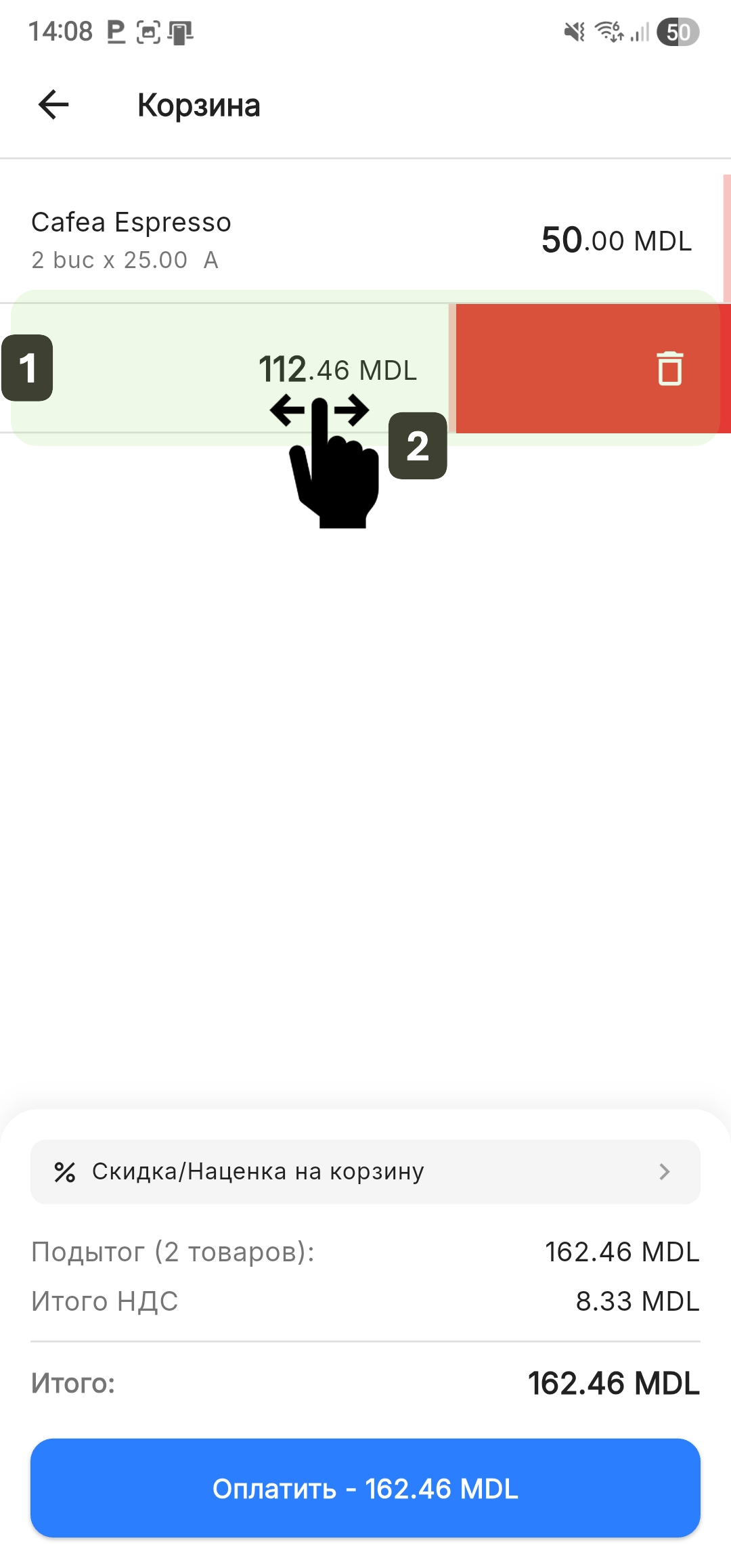 - Проведите пальцем (Swipe) по строке товара справа налево