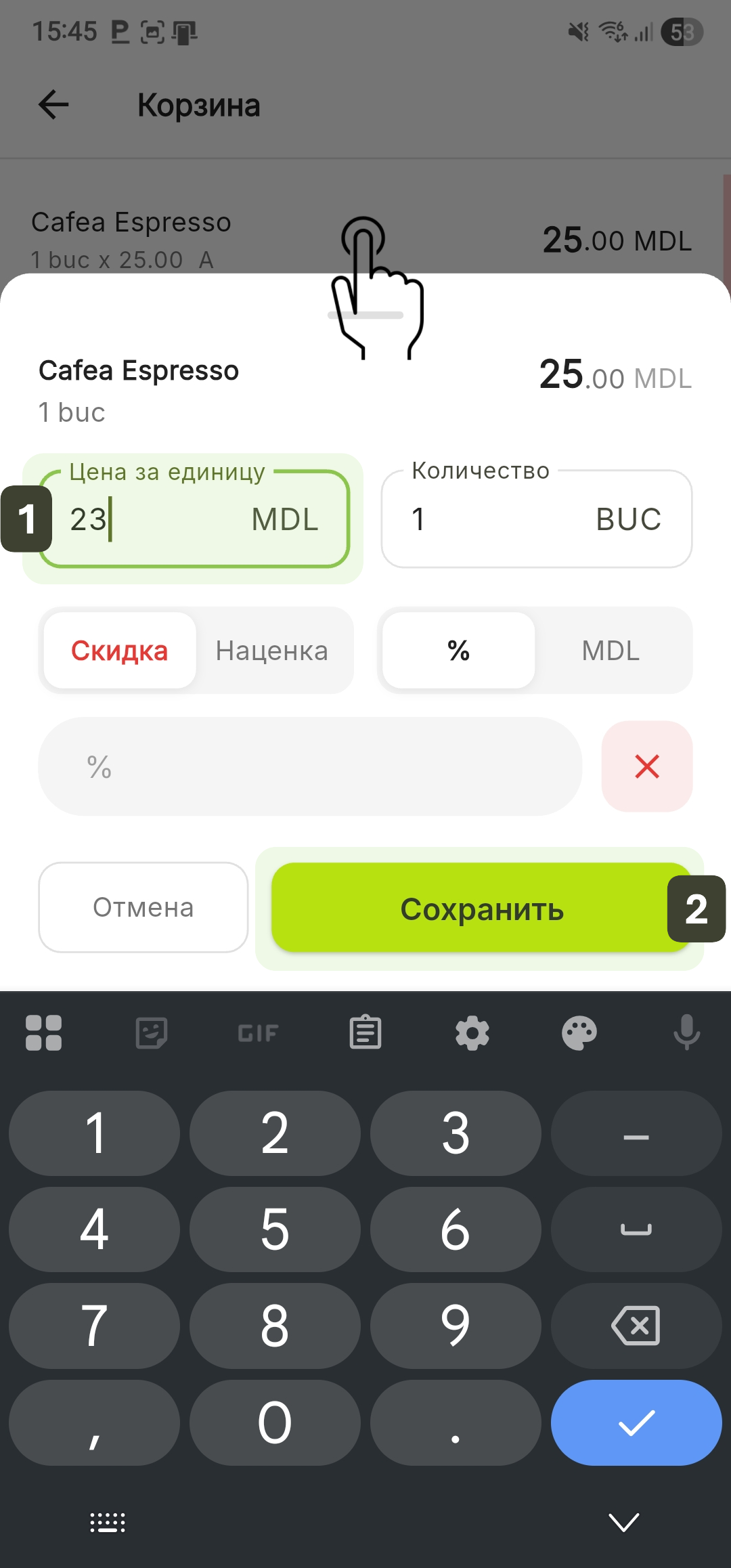 Эта функция позволяет скорректировать цену продажи для конкретного товара только для текущей транзакции, не изменяя базовую цену в общем каталоге.