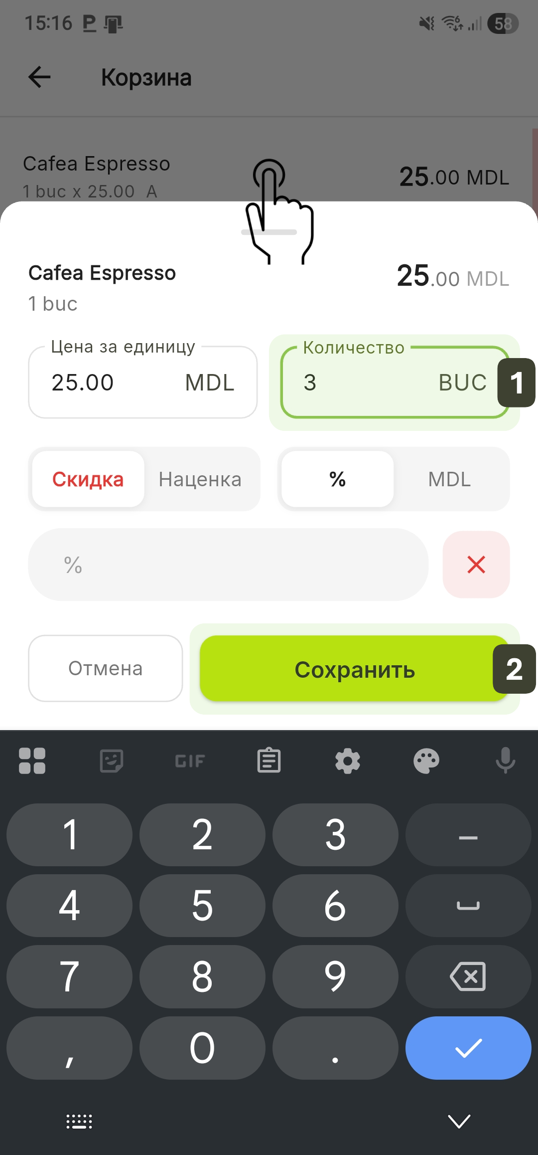 Вы можете увеличить количество, сканируя штрихкод товара несколько раз подряд. Каждое сканирование добавляет +1 к количеству.