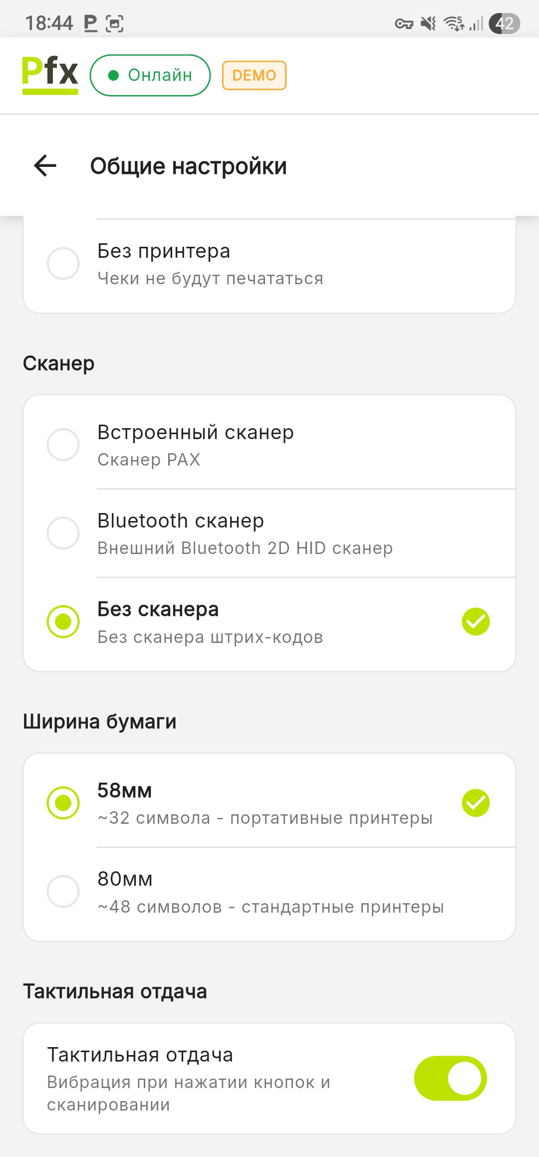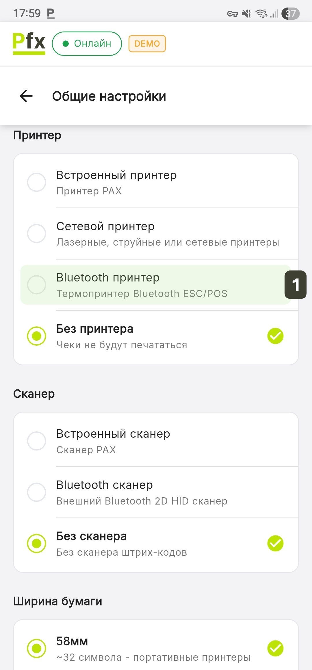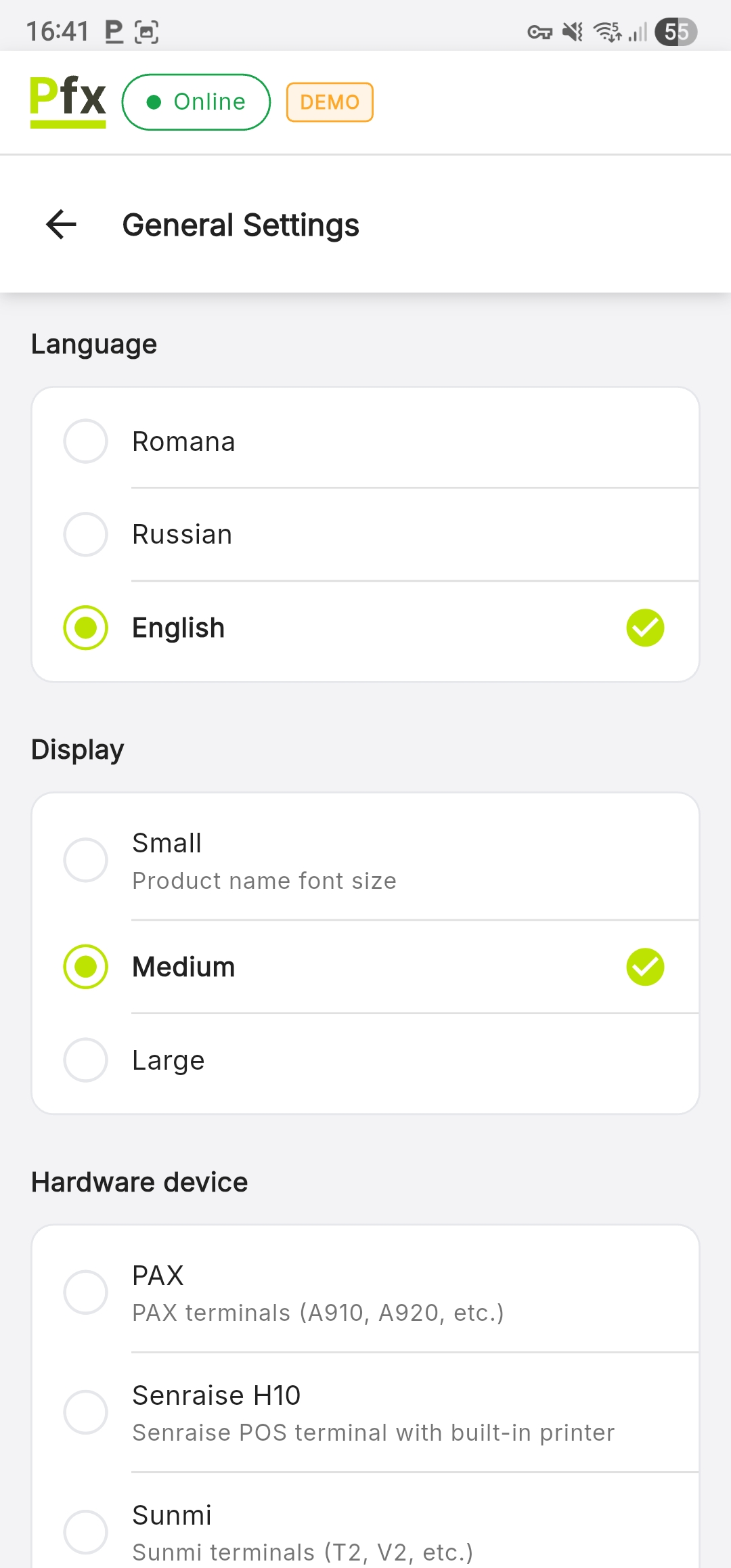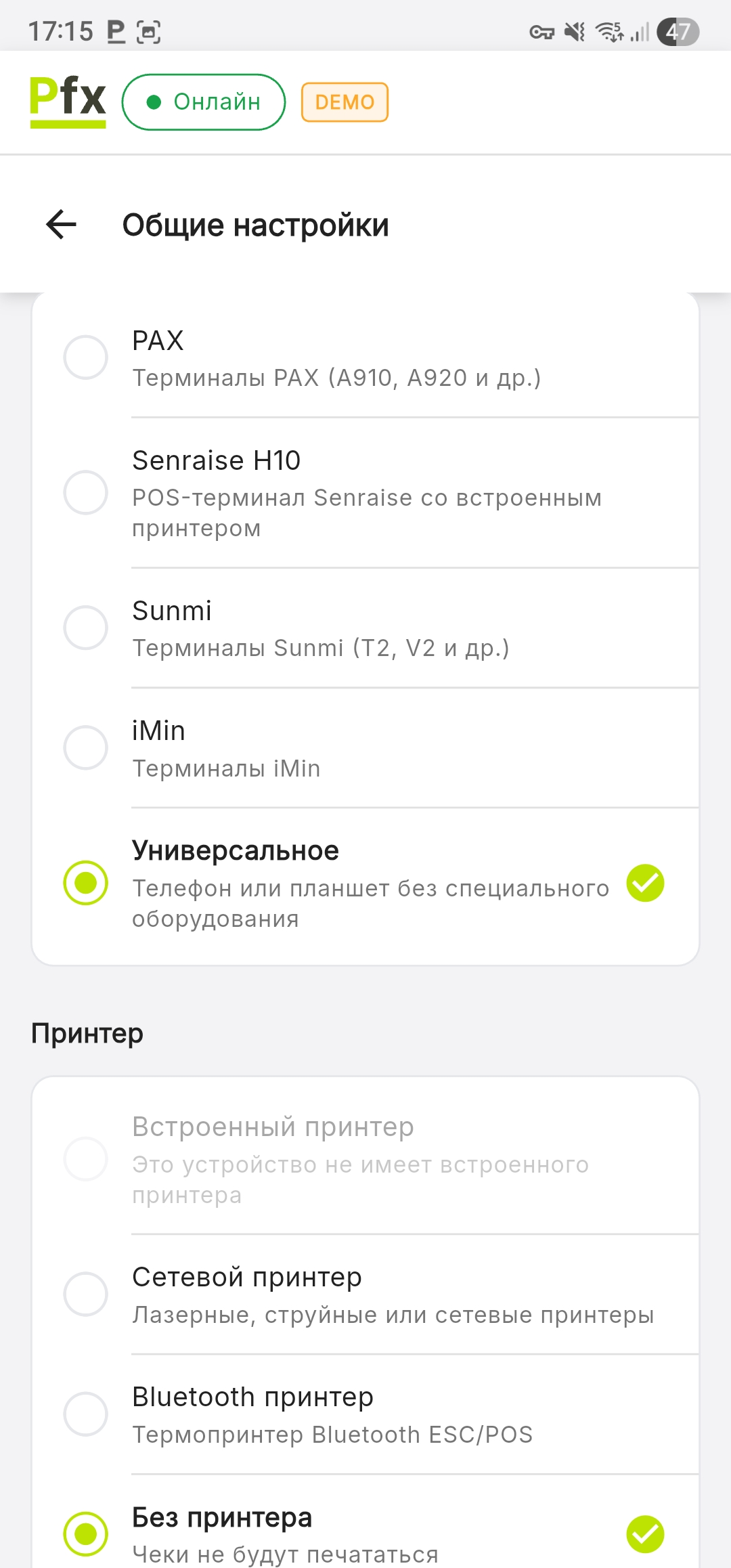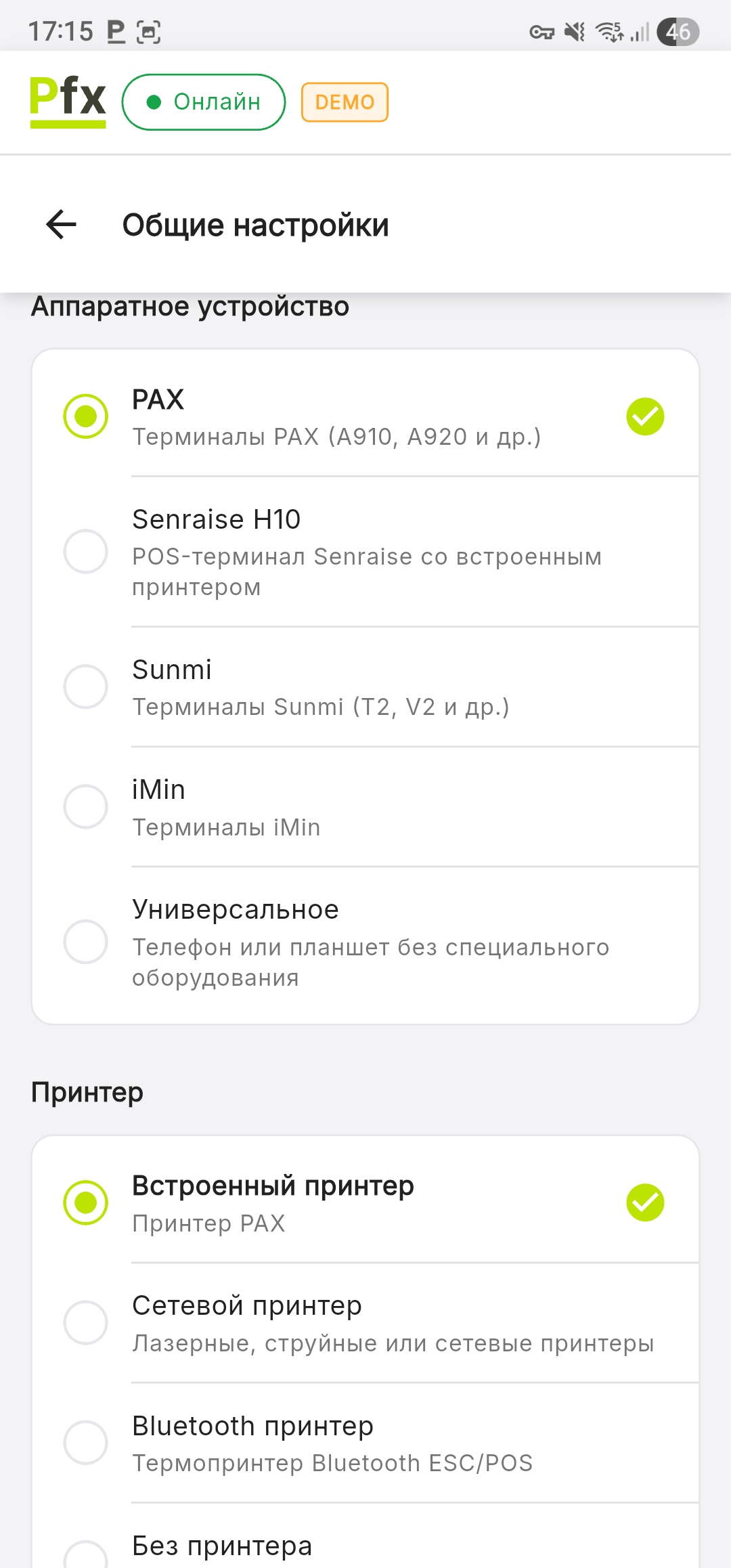 Выберите тип POS-терминала, на котором работает приложение. Эта настройка автоматически определяет, какие аппаратные функции доступны (встроенный принтер, встроенный сканер).