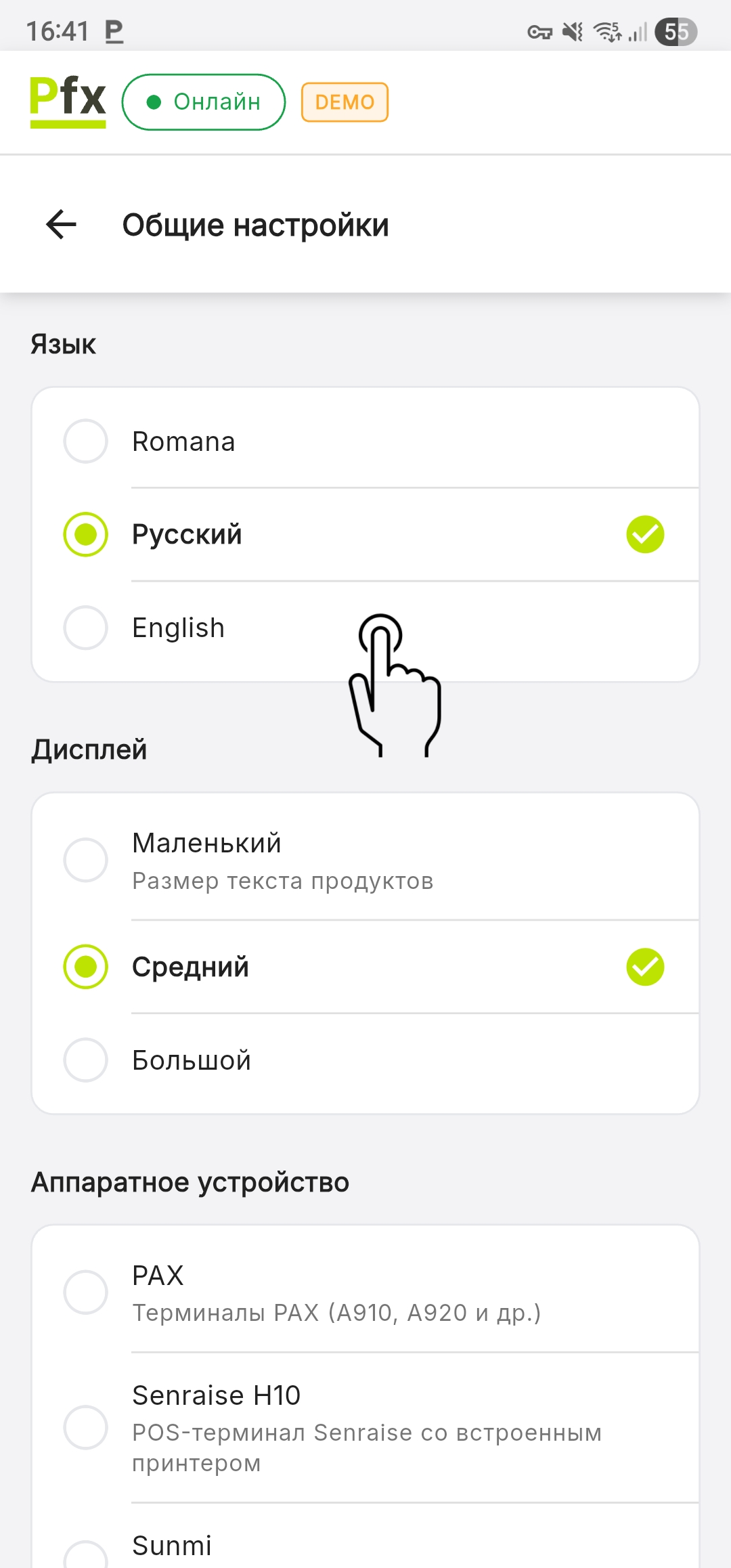 В меню Общие настройки нажмите на нужный язык. Интерфейс приложения будет переведён автоматически сразу после нажатия на новый вариант, без необходимости перезагрузки терминала.