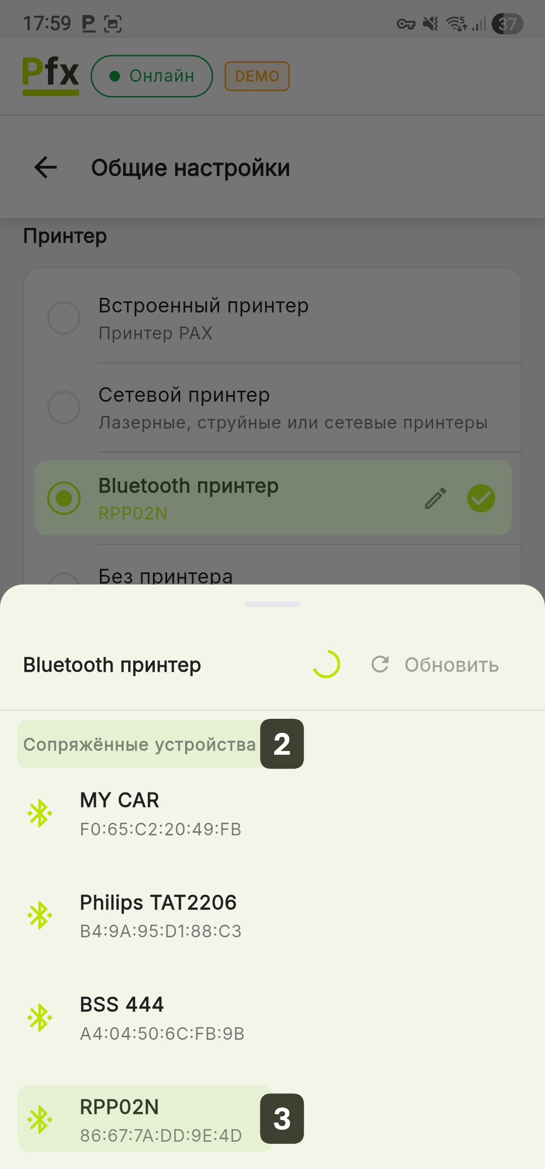 Перед использованием Bluetooth-принтера необходимо выполнить сопряжение (pair) в Настройки Android → Bluetooth.