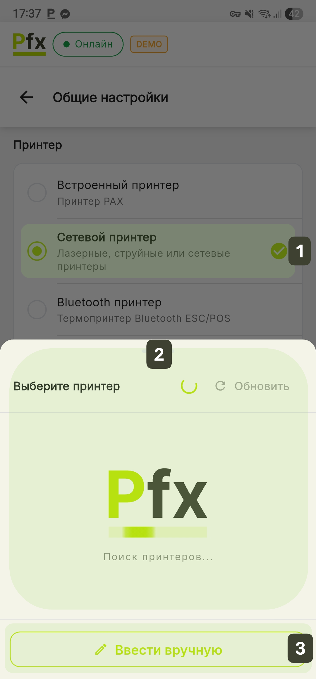 Убедитесь, что POS-терминал и принтер подключены к одной и той же сети Wi-Fi или LAN.