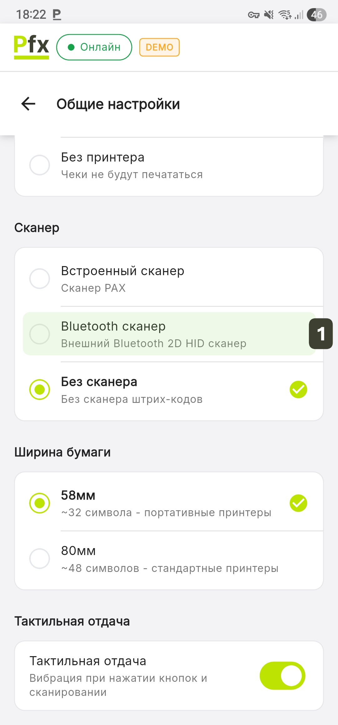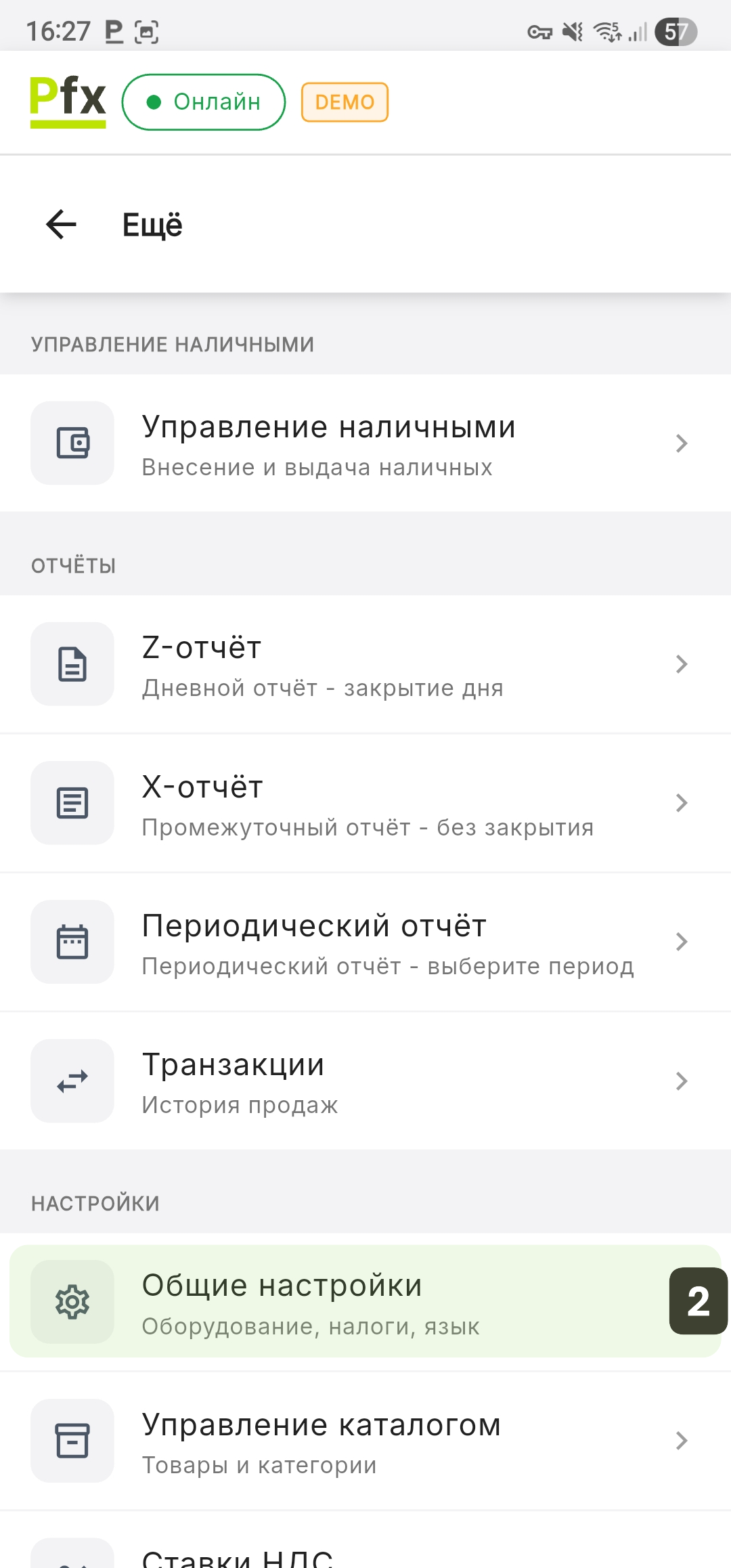 Изменения, внесённые в этом меню, применяются только локально, на текущем устройстве. Если вы используете несколько терминалов на одной торговой точке, вам потребуется повторить настройки на каждом устройстве отдельно для обеспечения консистентность работы.