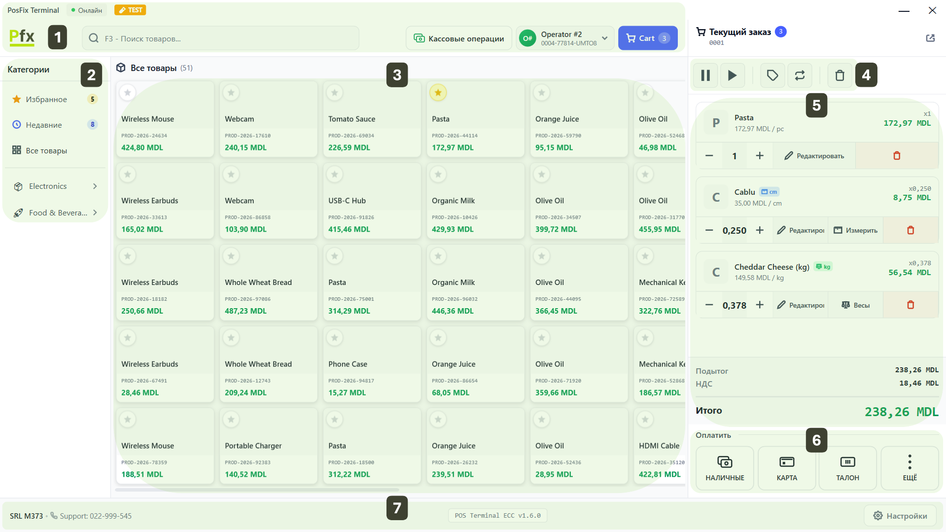 | 5. Корзина | Товары, добавленные для продажи (правая колонка) |